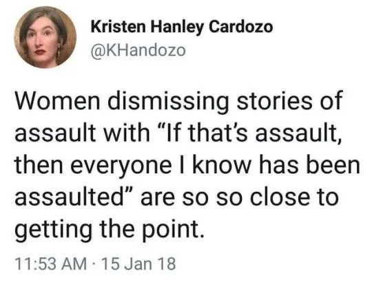 I’ll stop here to address a thought that I suspect may be running through some readers’ heads. Why didn’t she fight harder? Scream? Run away? Put her foot down and refuse to be moved? “I had this hope that maybe if I just do a little bit more,” she admitted, “if I give just a little bit more, he’ll like me.” Ahhh, and there it is. There’s your answer. Her mindset at the time was the result of an age-old, insidious, wickedly pervasive concept we pump into little girls’ heads as soon as they’re old enough to hear it. The concept is three fold: 1) your inherent worth as a woman/girl begins and ends with men, including your relationship to them and their acceptance of you; 2) as an extension of the former, your job as a woman is to make the men in your life comfortable at all cost, and therefore you are to be seen and not heard; and 3) just be cool.